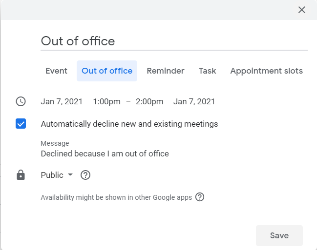2. Create an out-of-office (OOO) calendar event and decline any relevant meetings