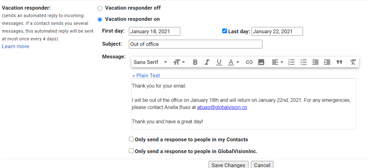 Don’t forget: Vacation days need to be planned at least 2 weeks in advance, but sick days or emergencies can be taken the day of.